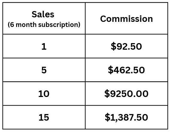 Our monthly membership on everything AI! Different payment options from monthly, all the way up to one year. The 6 month subscription is the most popular. Below is potential earnings if they buy the 6 month subscription. 50% Instant Commission