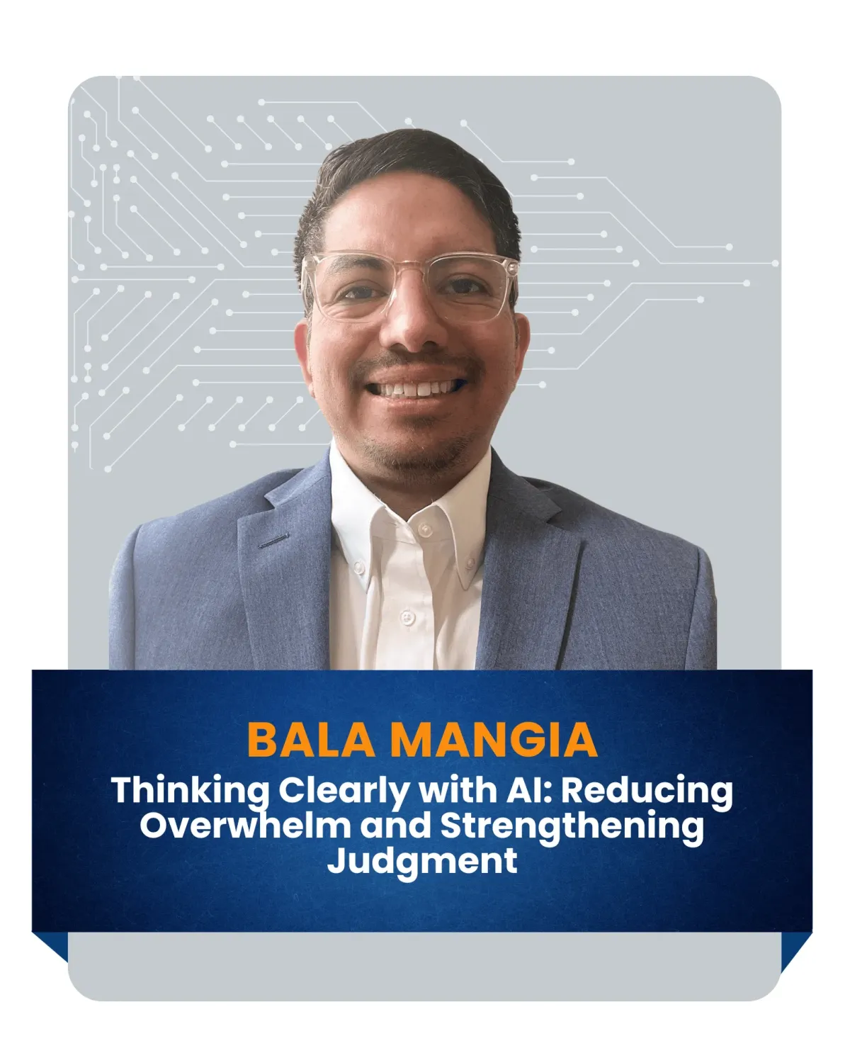 Bala Mangia helps people use AI as a thinking partner to gain clarity, reduce overwhelm, and make better decisions in real-world situations. Instead of emphasizing tools, automation, or technical skills, Bala focuses on how humans think under pressure—and how AI can support clearer reasoning, pattern recognition, and sound judgment without replacing human agency. Drawing on daily experience applying AI to idea development, decision-making, and sense-making across complex topics, Bala equips smart, capable professionals to stay grounded, sharpen their thinking, and navigate an increasingly noisy AI landscape with confidence and discernment.